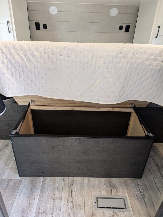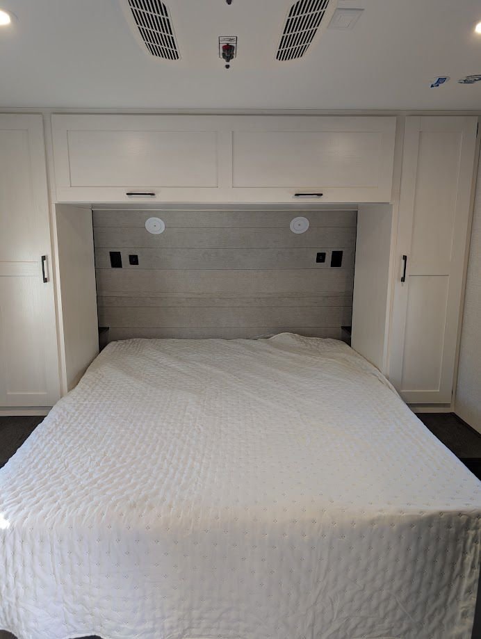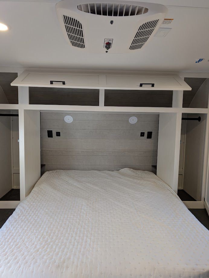 Bedroom Dresser (VBF) • Max Size Closets • StorMore Night Shelves • 60" x 80" Residential Queen Mattress • Reversible Heirloom Comforter • Large under the Bed Storage • Brookshire Shiplap Accent Wall
