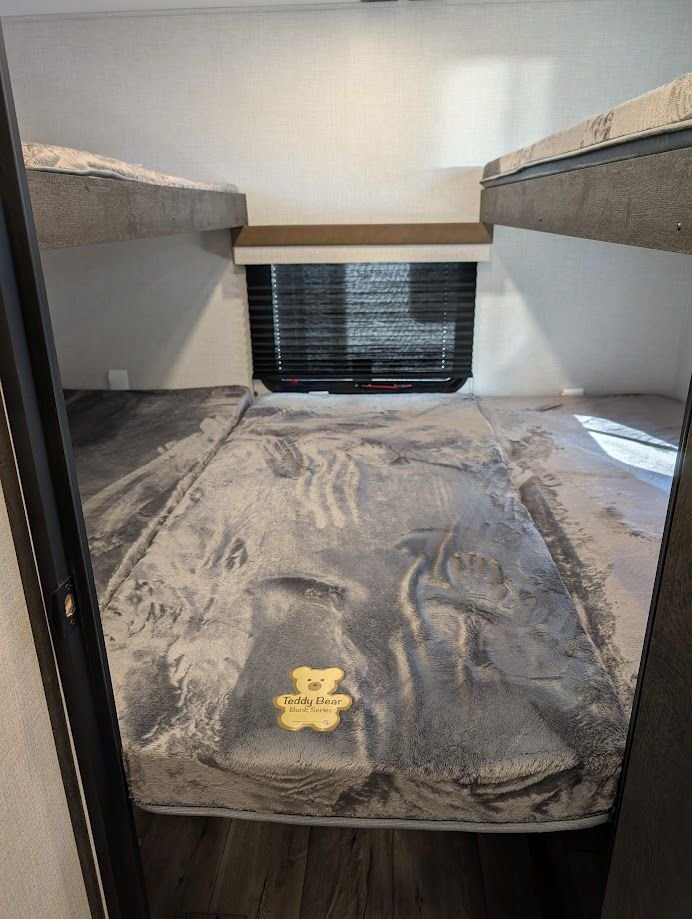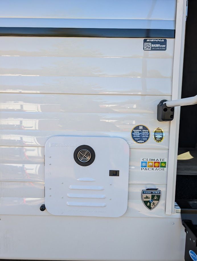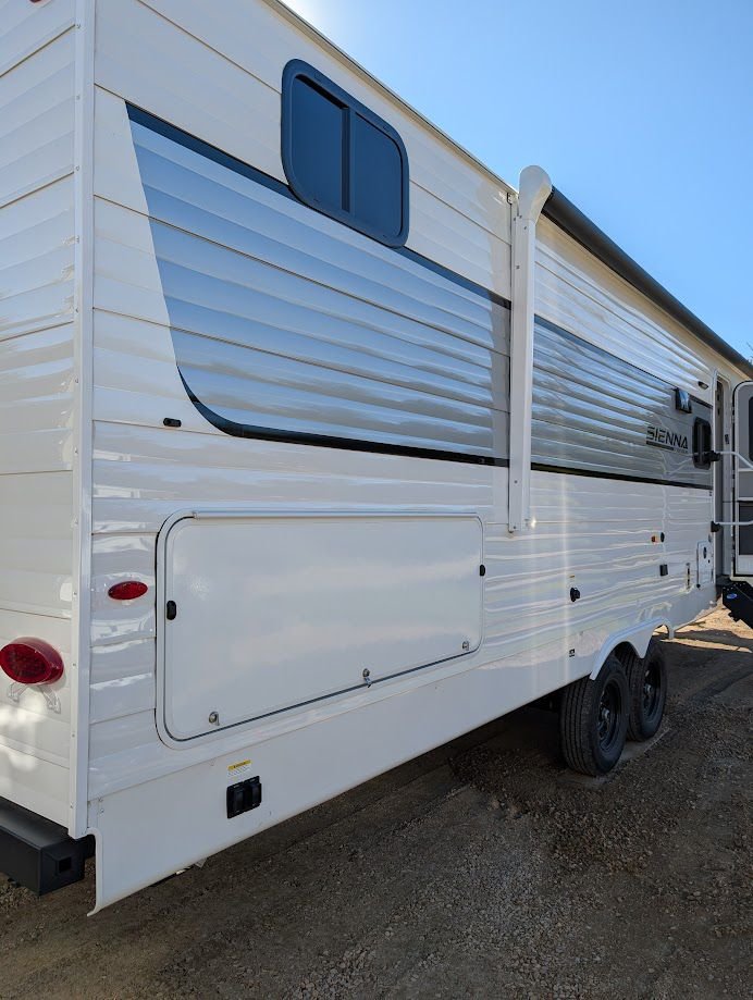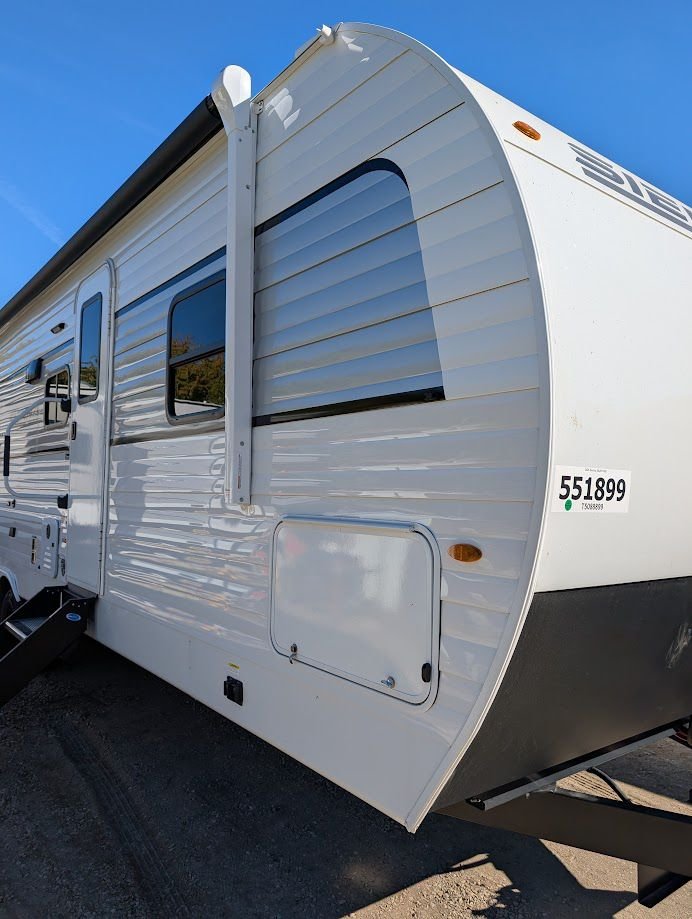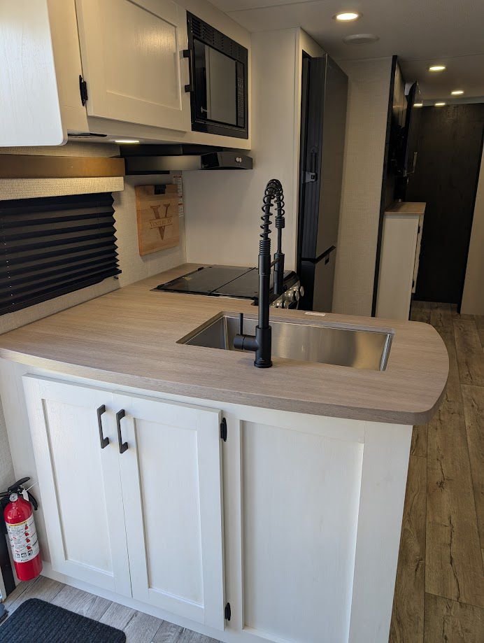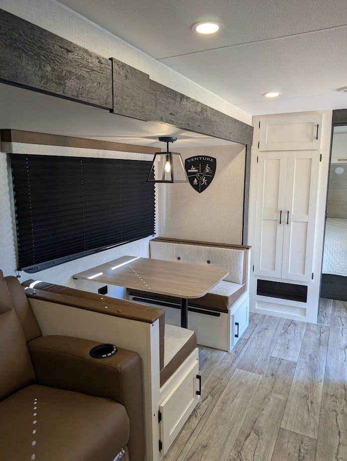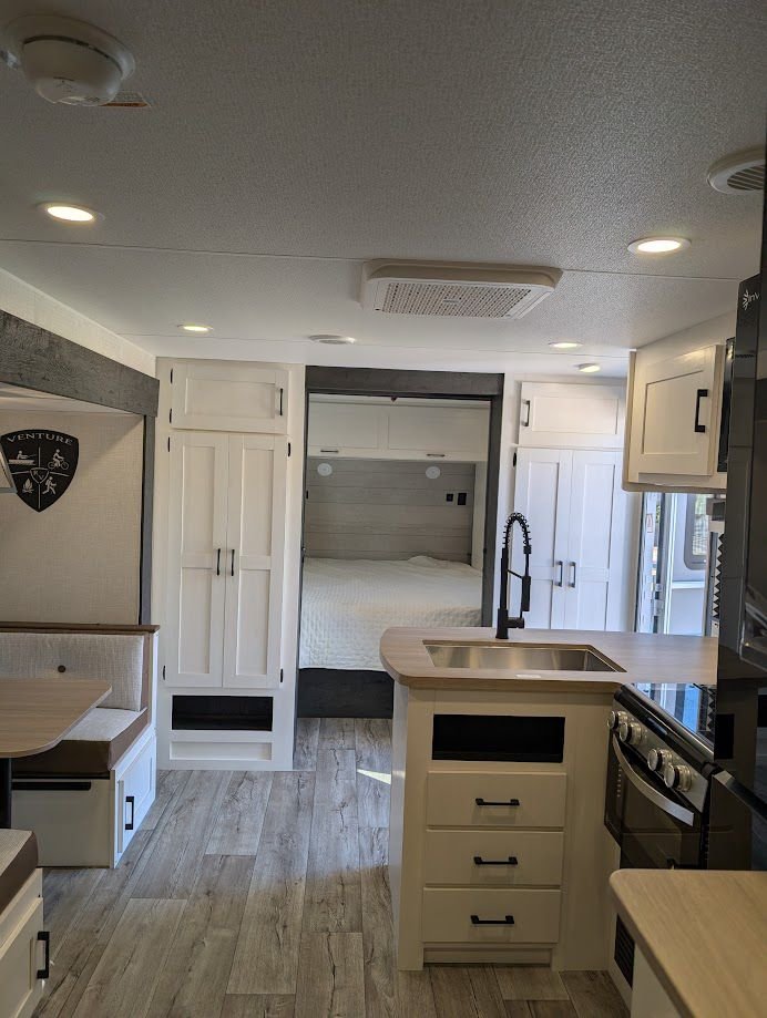 Flipside Reversible Dinette Cushions • Sit n' Slide Booth Dinette Table • Sofia Kitchen Backsplash • Solid Flip-up Entry Step • Tankless Water Heater • Bluetooth Speaker • King WiFi Prep • Entry Door w/Clearview Window • Large Single Bowl Stainless Steel Undermount Kitchen Sink • Modern Farm House Interior Design Cabinet Doors • Surfside White Cabinets in Kitchen, Bedroom & Bathroom • Bladen Oak Cabinets in Living Room & Bedroom • Motion-Activated Bathroom Nightlight • Main Control Panel • 12V 10 CU FT Refrigerator • Venture RV Cutting Board • Tucked Bumper • New Upgraded Residential Furniture • Residential Queen 60" x 80" Mattress • Pet Defender Screen Protector • Beauflor Slideout Floors (No Carpet) • Roof-Mounted Solar Prep • Prewired Tire Monitor System