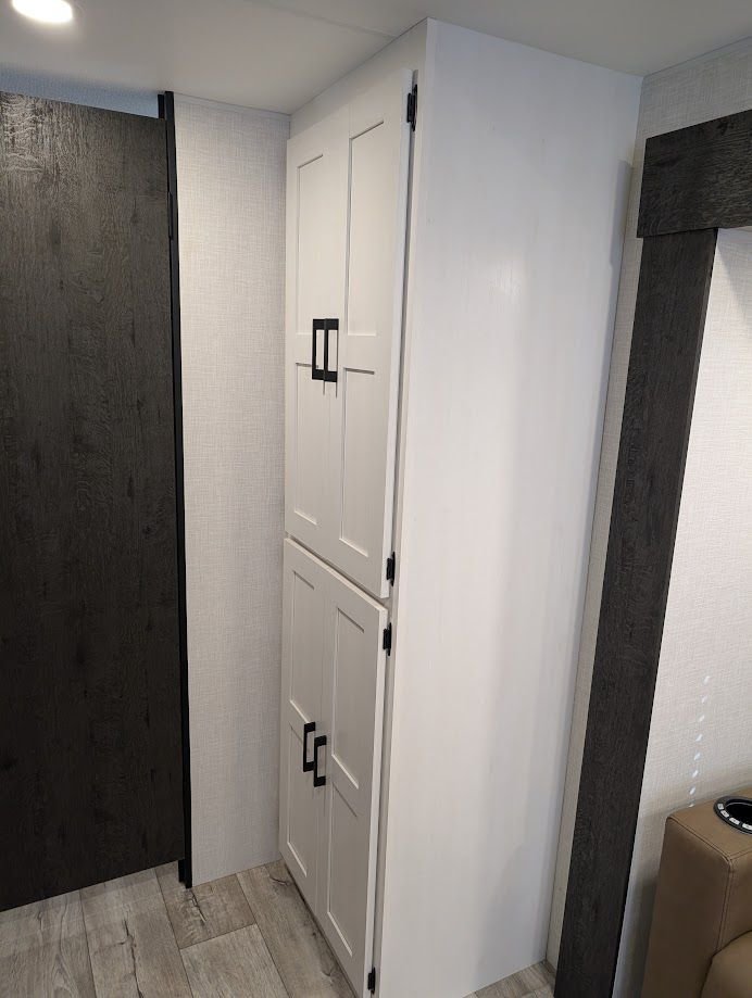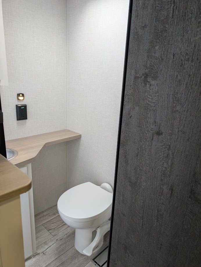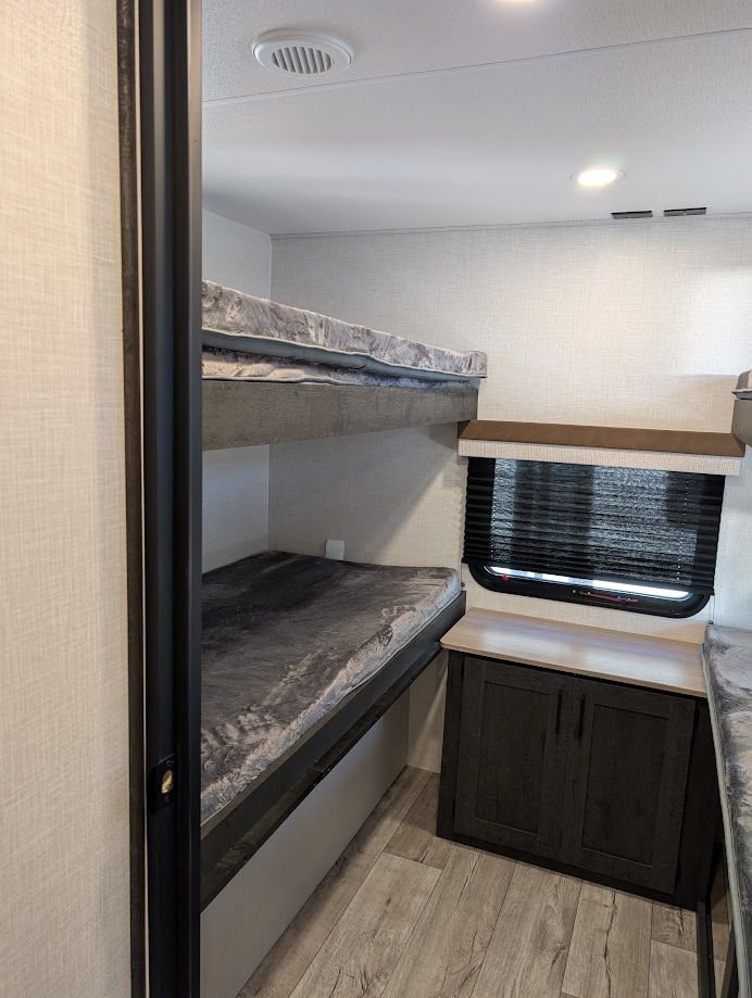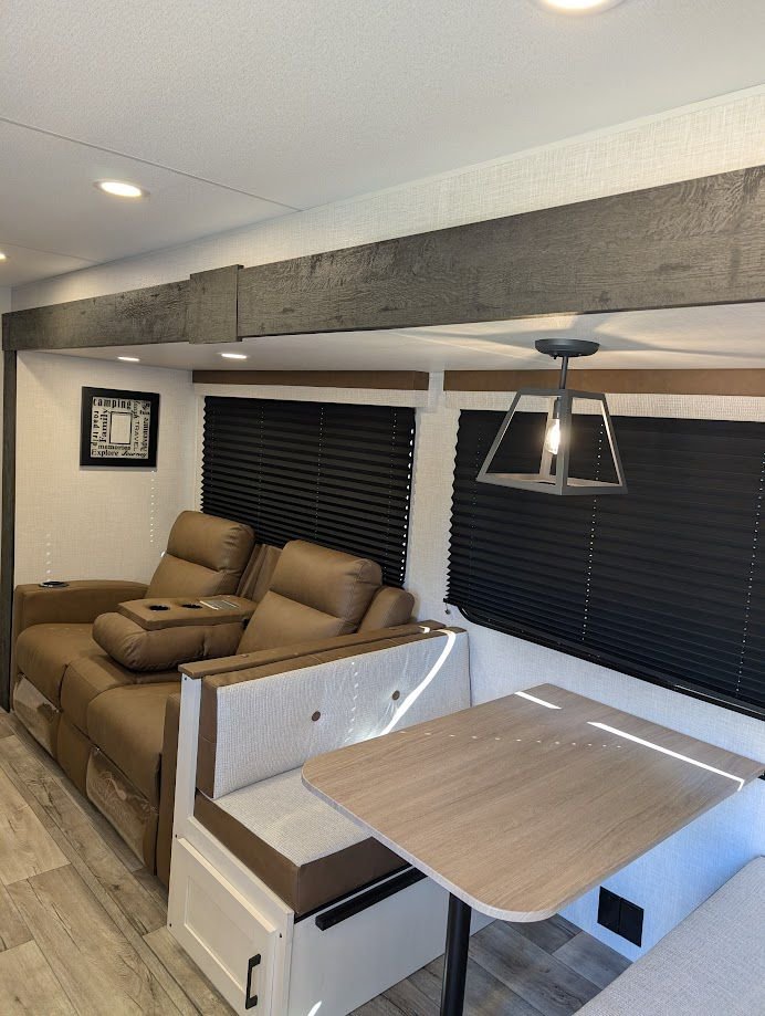 Modern Farm House Design • Two Wood Colors (Surfside Maple & Bladen Oak) • Sit n' Slide Dinette Table • Flipside Reversible Dinette Cushions • Board & Batten Accent Walls • Flush-Floor Slideouts • 40" Smart TV w/Swing Arm • 5,000 BTU Electric Fireplace • Steel Trimmed Entry Door • Beauflor Throughout, 0 Carpet • Motion Lighting Entry Door Hallway • Motion Lighting in Pantry