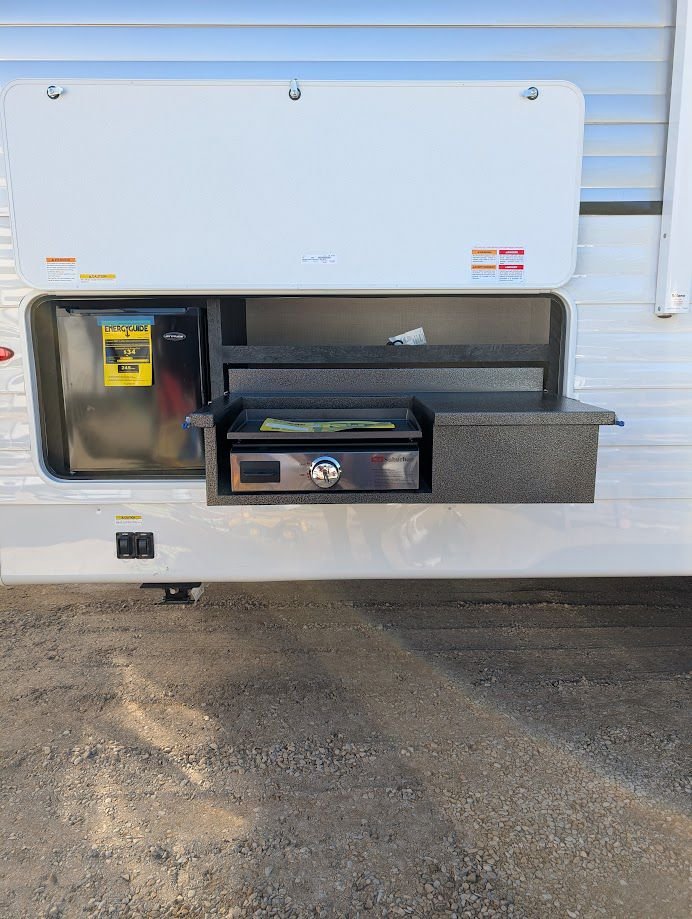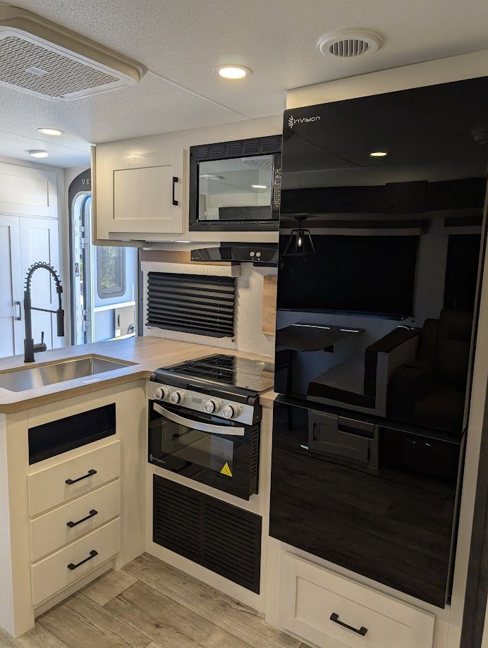 On-Demand Tankless Water Heater • InVision Appliance Suite: 10 CU FT 12V Refrigerator, Modern Designed Range Hood, 18" 3-Burner Stove Top w/Oven, InVision Microwave • 30K BTU Furnace • Washer/Dryer Prep (VBF) • Central Command Center • Coleman 15K A/C • (2) 20# LP Tanks