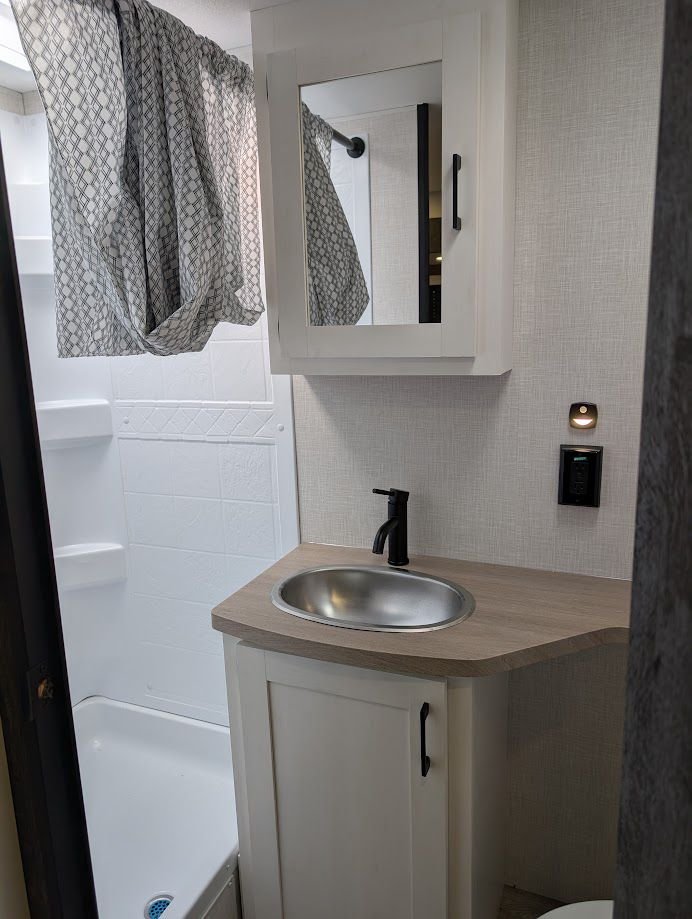 Motion Activated Lighting • Sky Light above Shower • Stainless Steel Sink • Steel Faucet • Power Vent • Porcelain Foot-Flush Toilet • Medicine Cabinet w/Storage