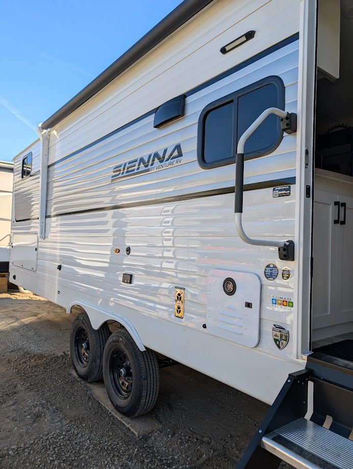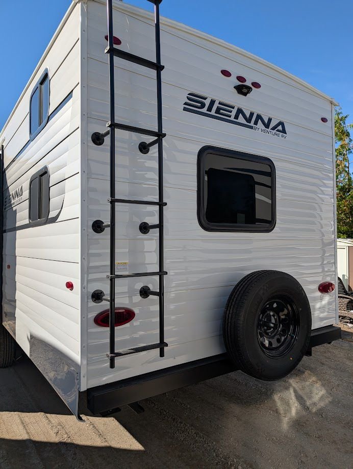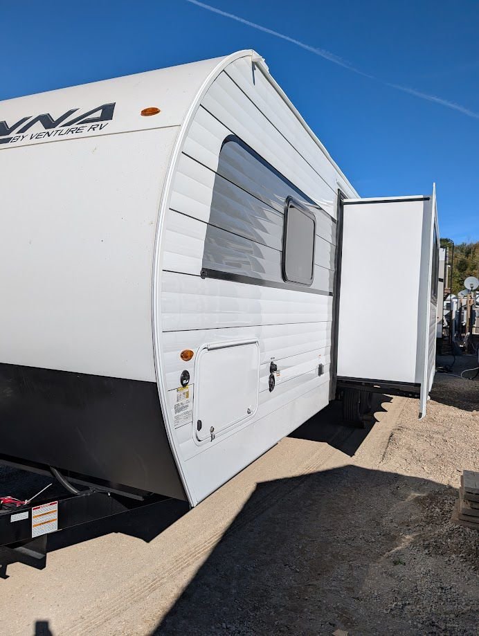 Friction Hinge Entry Door • Large Assist Grab Handle • Tinted Safety Glass Windows • NXG Huck Bolt Frame • 15" Radial Tires w/EZ Lube Hubs • Spare Tire • Dexter Axles & Hubs w/Self-Adjusting Brakes • (2) 20# LP Tanks w/Easy Access Cover • Walkable Roof • Gutter Rails w/Downspouts • Gutter Rails above Slideouts • Quick Disconnect Outside Water Port• Black Tank Flush • Marine Grade Detachable Power Cord • Prewired for Observation Camera • Cable & Satellite Connection • Digital Antenna Receiver • High-Efficiency LED Exterior Lights • Motion Activated Pass-Thru Storage Light • Keyed Alike Key System • Battery Disconnect • Spare Tire & Carrier • Venture RV Bottle Opener/Dog Tie Down • Aluminum Flip-up Entry Steps • New Composite Exterior Step • Level Mate Pro Bluetooth Leveling